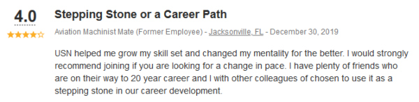 Hay muchas reseñas en Indeed.com sobre el servicio en la Marina como compañero de maquinista de aviación (AD).