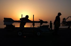 Los AO mueven un AIM-9M Sidewinder a un avión en la cubierta de vuelo del USS Kitty Hawk (CV 63). (Fuente: Wikimedia )