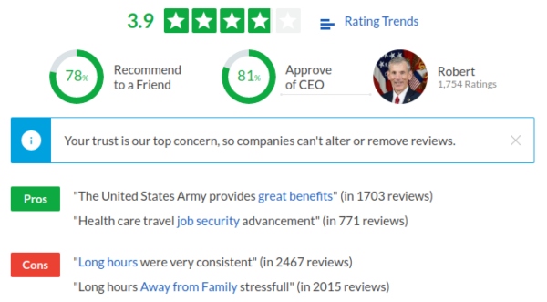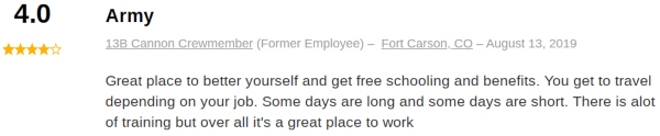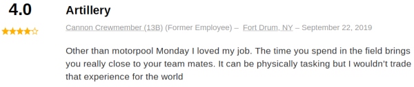 Las revisiones de trabajo para Army Cannon Crewmember (MOS 13B) son positivas.