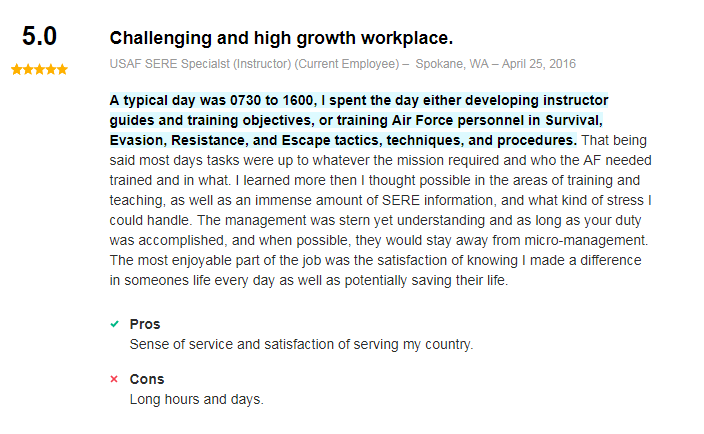 Esto es lo que dos ex especialistas de SERE dijeron sobre el tiempo que pasaron en la USAir Force en reseñas publicadas en el sitio web Indeed.com :