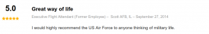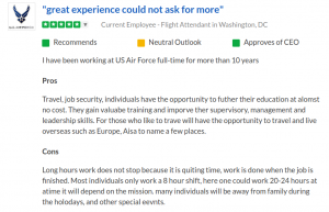 Las reseñas de ex asistentes de vuelo de la Fuerza Aérea tanto en Indeed.com como en Glassdoor.com son abrumadoramente positivas, pero asegúrese de mencionar las largas horas y el arduo trabajo que se requiere para ser un FA de la Fuerza Aérea.