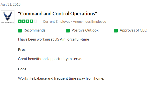 Aquí hay un par de reseñas tomadas de glassdoor.com que fueron escritas por quienes han servido en Operaciones de Comando y Control de la Fuerza Aérea: