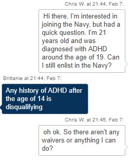 Hablé con un reclutador de la Marina a través del chat y me dijo que cualquier historial de TDAH después de los 14 años descalifica.